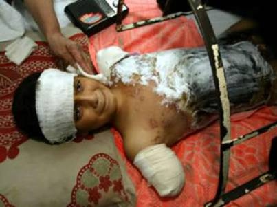 Abbas, 12, wounded during an airstrike according to hospital sources, lies in a