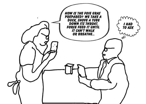 But another cruel delicacy banned in Chicago for a short time in 2006, remains legal. Foie gras is a delicacy that requires geese and ducks to be force fed to bloat their livers, often until they can barely walk, their throats are bloody or punctured and they struggle to breathe. Few who have viewed videos of foie gras production, widely posted on the Web, will eat it again.