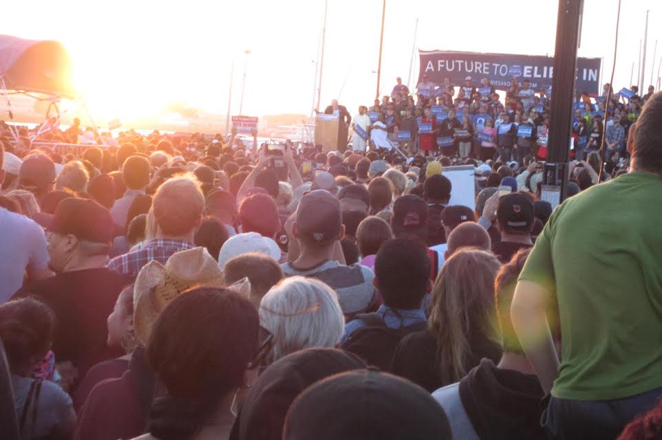 The gathering was held in a huge grassy area alongside the water estuary. The area was enclosed with security fencing so that audience members all had to pass through metal detectors. One and half hours before Sanders’ speech, the line to go through the security screening was half a mile long. Yet spirits were high with a buzz in the air.