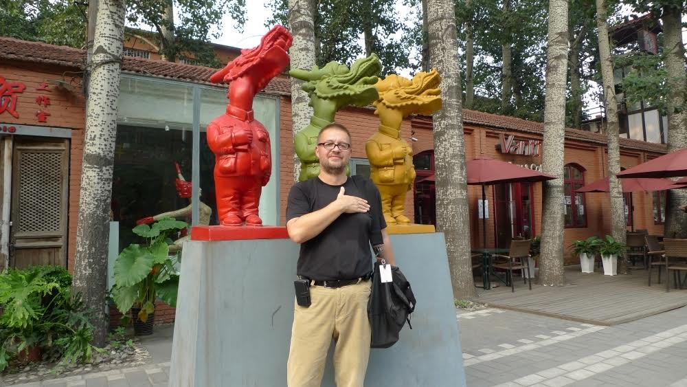 Andre Vltchek in the Bejing Art District with “his dragons”