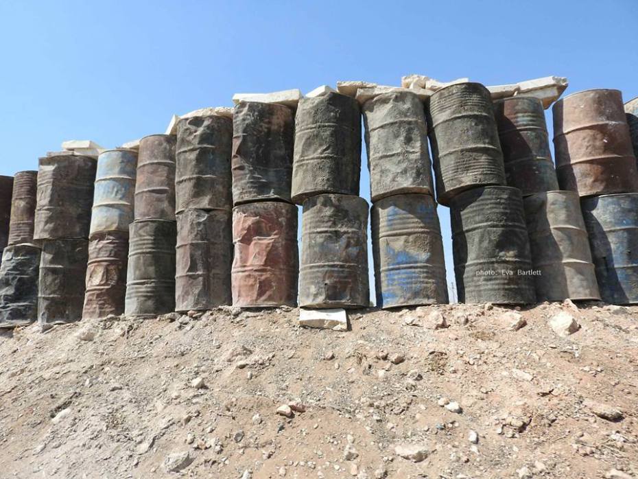 Entering the outskirts of the city, driver points to a cement factory roughly 400 m away. Beyond that factory, in Sheikh Saeed, terrorists, he says. We pass barrels stacked to screen cars from terrorist snipers’ bullets, then embankments of sand and earth, for the same purpose. Dipping into a small valley, a block of apartments in al-Ramouseh is in view.