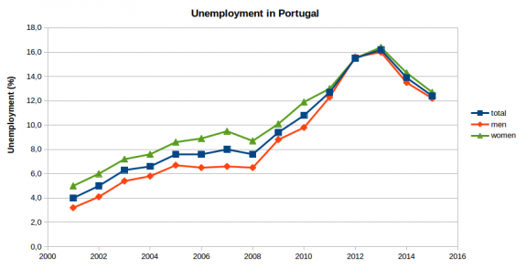 Unemployment numbers in Portugal since joining the Euro (data from the Portuguese National Institute of Statistics)