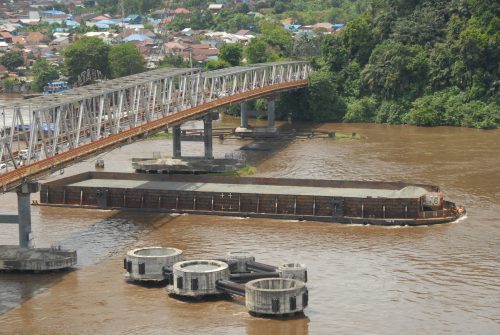 One morning I looked from my hotel window in the city of Samarinda (East Kalimantan), spotting an enormous coal barge. It was sitting right in front of me, stubbornly, under the bridge (one of only two bridges connecting two shores of this steamy city of 850,000). The barge was too big to move, as the current appeared to be too strong. One push boat and one tugboat were trying to move it against the torrent, in vain.