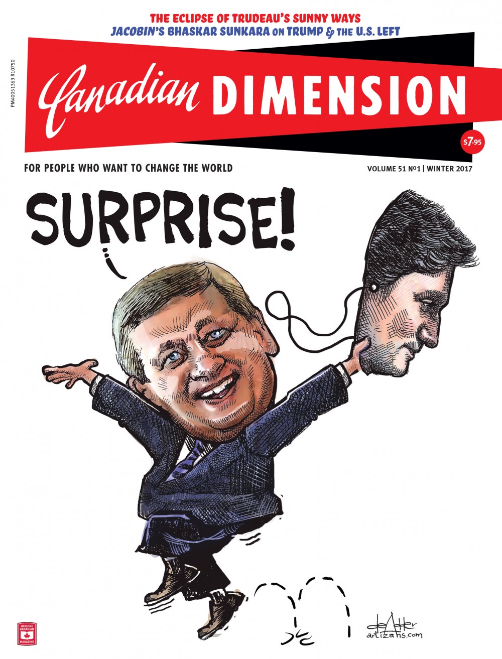 A recent cover of Canadian Dimension magazine provided a cheeky challenge to Trudeau’s bait and switch. Below the word “SURPRISE!” it showed a Justin Trudeau mask being removed to reveal Stephen Harper.