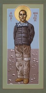 Mark Scibilla Carver and Jack Gilroy had driven to Chicago from Upstate NY, carrying with them a life size icon bearing an image of Salmon, standing alone in what appeared to be desert sands, wearing a prison-issue uniform that bore his official prison number. Next to the icon was a tall, bare, wooden cross. Rev. Bernie Survil, who organized the vigil at Salmon’s grave, implanted a vigil candle in the ground next to the icon. Salmon’s grand-niece had come from Moab, Utah, to represent the Salmon family. Facing our group, she said that her family deeply admired Salmon’s refusal to cooperate with war. She acknowledged that he had been imprisoned, threatened with execution, sent for a psychiatric evaluation, sentenced to 25 years in prison, a sentence which was eventually commuted, and unable to return to his home in Denver for fear of being killed by antagonists. Charlotte Mates expressed her own determination to try and follow in his footsteps, believing we all have a personal responsibility not to cooperate with wars.