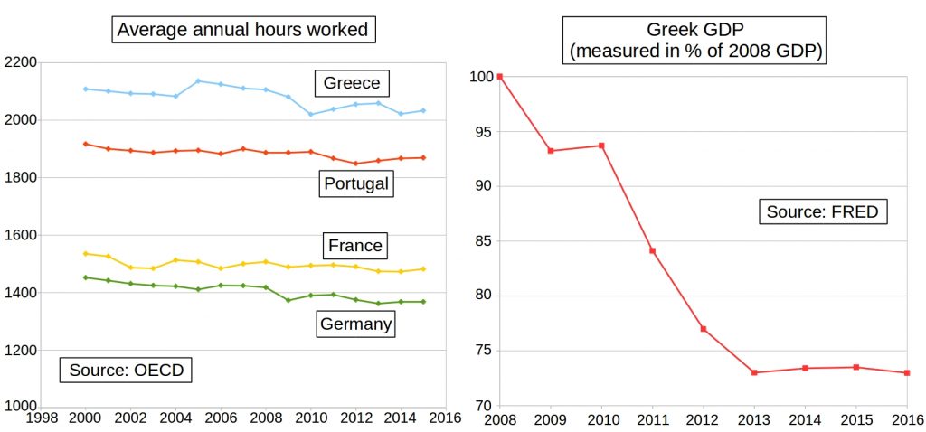 Facts and myths: the left plot shows the average number of hours of work in Greece, Portugal, France and Germany (from 2000-2016), and the right plot shows the fall of Greek GDP since 2008.