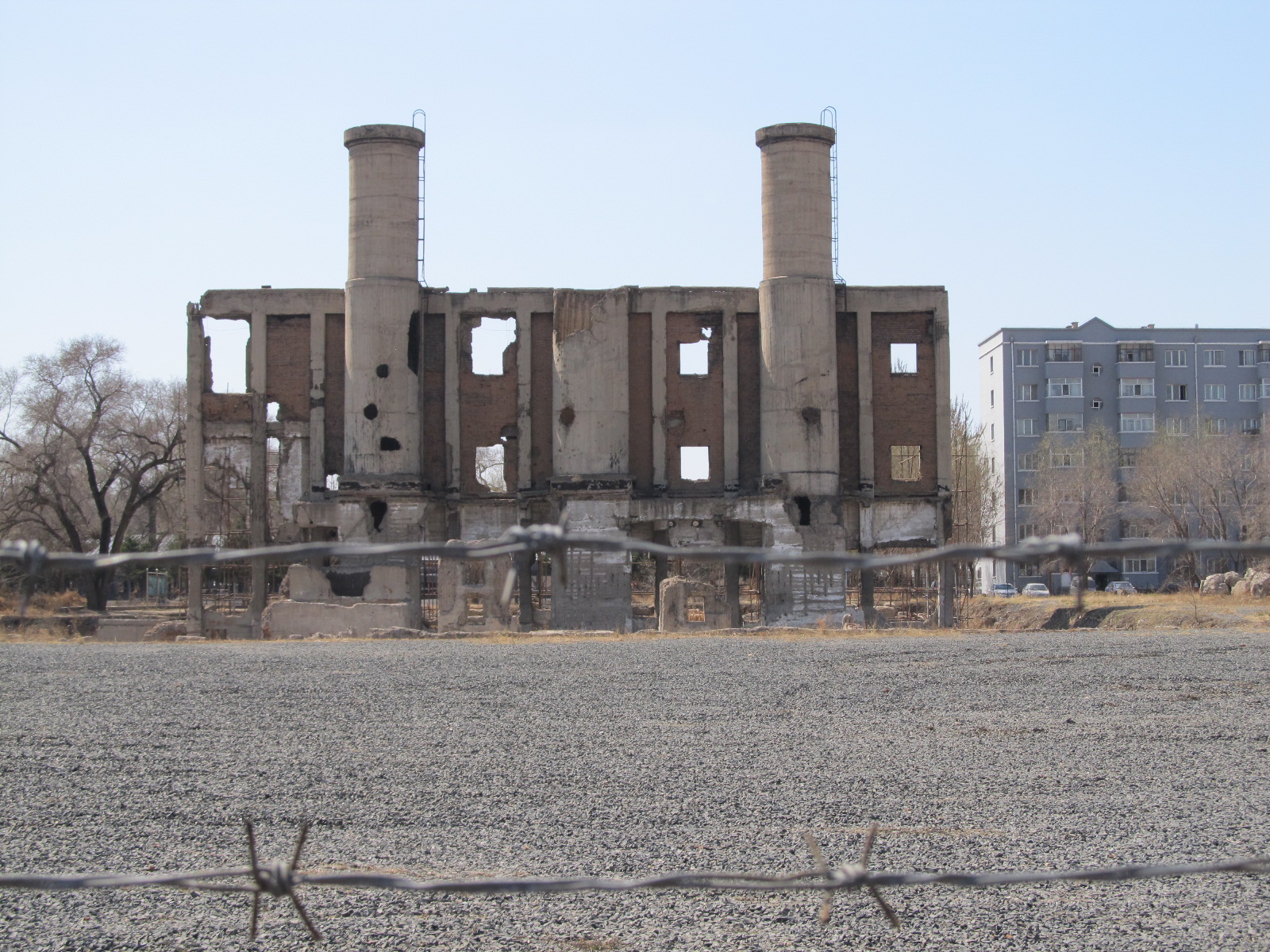After alighting the bus, I walked down a side street and came to a gravel field surrounded by barbed wire fencing; in the near distance stood the ruins of Unit 731’s boiler. I crossed the gravel field to see the ruins close up and then proceeded to the Exhibition Hall of Evidence of War Crimes by Japanese Army Unit 731 (Unit 731 Museum). The museum opened to the public on 15 August 2015; admission is free and translations of the evidence are available in English, Japanese, Korean, and Russian.