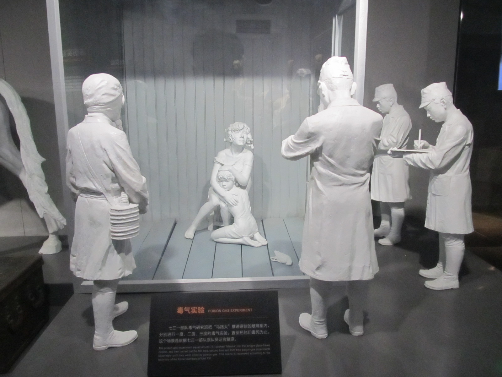 Another shocking exhibit was of an airtight cubicle in which two frightened, young girls were clinging to each other. Outside the cubicle stood four Japanese observing and recording the effects of the poison gas experiment. These experiments were repeated until the victims died.