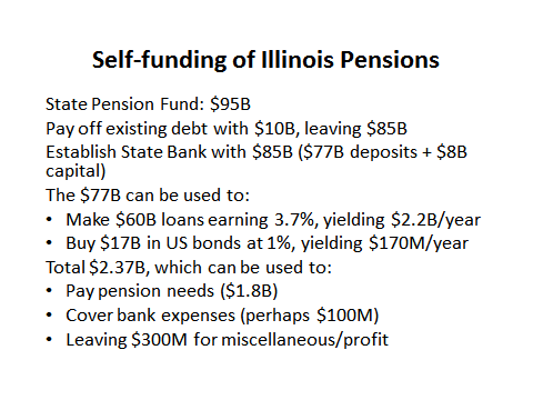 Illinois could follow North Dakota’s lead. Looking again at the Illinois CAFR (page 45), the amount paid out for pension benefits in 2016 was only $1.833 billion, or less than 2% of the $94.6 billion pool. An Illinois state bank could generate that much in profit, even after paying off the state’s outstanding budget deficit.
