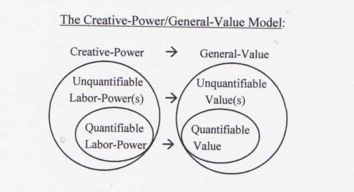 This model outlines the notion that creative-power has a hand in both producing general-value and, more specifically, scientific quantifiable value. Although creative-power is not acknowledged within Marx’s rational labor theory of value; i.e., the law of value, and is, in fact, dismissed as unproductive, creative-power, nonetheless influences the capitalist modes of production, consumption and distribution, so much so that creative-power is, in fact, the source of both general-value; i.e., unquantifiable values, and scientific quantifiable value. Creative-power acknowledges the litany of unquantifiable powers and unquantifiable values that inform value, price and wage-determinations. Creative-power is plural and heterogeneous, the general-value it produces is multi-varied, unlimited and diverse, while Marx’s notion of labor-power is singular and homogeneous, and the value it produces is specific, limited and alike. Marx’s analysis permits only one form of labor-power as being value-producing and Marx’s analysis permits only one form of value as being valuable and contributing to price/wage-determinations. For Marx, this is abstract labor, abstract labor is what all commodities share, regardless of their particularities, and abstract labor is labor-time, expended in production and conforming to the parameters of social necessity within a specific sphere of production.