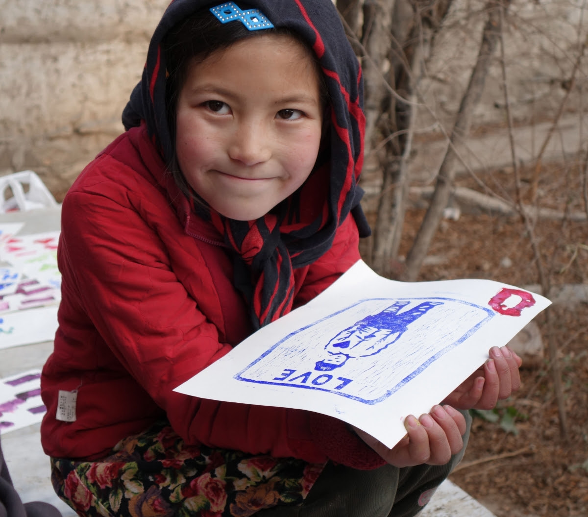 Listen for the chuh-chuh-chuh, Aaron says, imitating the sound the roller makes when it is sucking up blue paint. He directs Imam, another boy at the street kids school, to make sure the roller catches the corners of the linoleum. Imam’s eyes brighten as he lifts the paper to reveal his self-portrait.