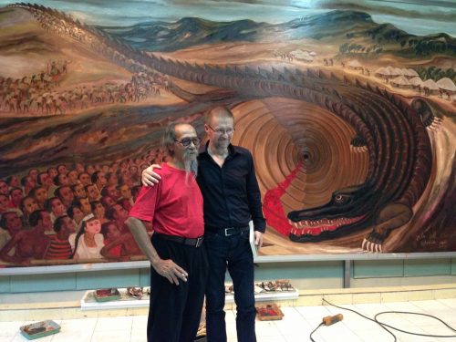 ‘Djo’ is standing in front of his huge painting depicting a disgusting crocodile. The crocodile is literally devouring Papua. And the Papuan people are still somehow resisting, with spears… It is clearly a lost fight, but a fight it is, nevertheless.