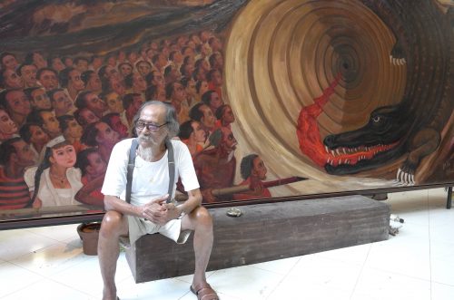 I walk through his studio and reconnect with his iconic paintings: there is a woman ‘given’ to an old man as a wife, a young girl being indoctrinated by her father; there are corrupt government officials eating everything around them, and there are the horrors of the US-sponsored 1965 military coup.