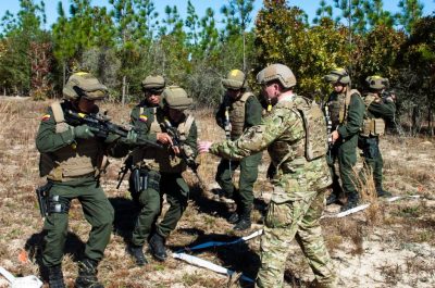 A U.S. Army Green Beret, center foreground, instructs members of the Colombian Compañía Jungla (photo from the US DOD)