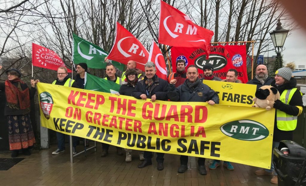Greater Anglia picket line at Ipswich on Jan 10 for strike over safety and keeping the guard on the train (Photo: RMT)