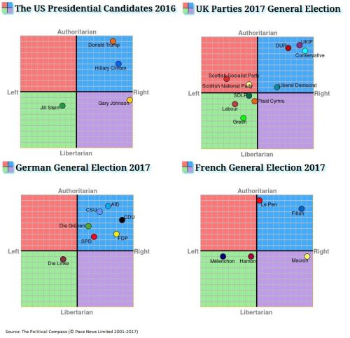 Compared to the multi-party democracies of many European countries, which cover a broader range of ideologies and policies on the political spectrum, mainstream political discourse in the United States occurs almost exclusively between the center and the far right. The following charts depict the major political entities in the United States, the United Kingdom, Germany, and France in their respective general elections over the past year. It becomes apparent that, even in the context of growing uncertainty as reflected in more recent developments in Europe — such as the refugee crisis, anti-globalization forces, or increasing anti-EU sentiment — European political cultures still include a far greater space for decidedly left alternatives and counterweights to the prevalent right and conservative trajectories in recent years.