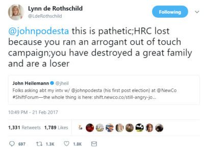 Releasing on February 21, 2017 what in hindsight appears to be a twitter overshare, Rothschild publicly castigates Podesta as ‘pathetic’ and a ‘loser’. Nothing subtle there. As Tom Jones might say she’s a Lady even when she slips.