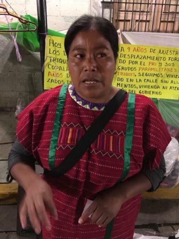 For ten months we resisted with no water, no food, no electricity as the PRI-government had cut us off from everything. The date of 16 September 2010 was when PRI-backed paramilitaries entered our community, first to the municipality building, and used big microphone to tell us to leave our houses. We were not given any time at all to leave. Because they saw smoke come from houses, which was basically because we were cooking, they were shooting at our houses and us. We just had to escape with nothing and were forced to find a way to survive with our children, with nothing at all, not even our id cards. We needed to make sure to escape with our children because we were warned that if we didn’t, then they would burn alive our children. By 18 September 2010, PRI-backed paramilitaries started entering our houses, burning and destroying them. We fled as by then they had killed another community member who had been resisting forced displacement. This is when a group of women started demanding the State Government to intervene in our community. The State nor Federal Government ever intervened. We demanded that something is done, so that we could safely return to our community. Since September 2010, we have been here. But they have never done anything to let us return, nor to get rid of those who displaced us because they were the accomplice of those paramilitaries who made us forcibly displaced.