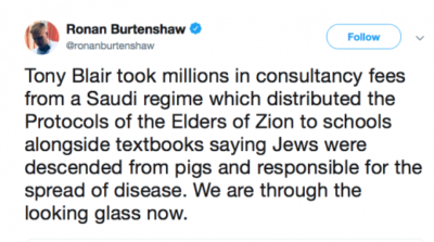 Also, Blair has been fabulously remunerated by Saudi Arabia for working as a consultant to the head-chopping regime, one that has funded a militant Islamic extremism across the Middle East, destabilising the region and contributing to countless more deaths.