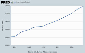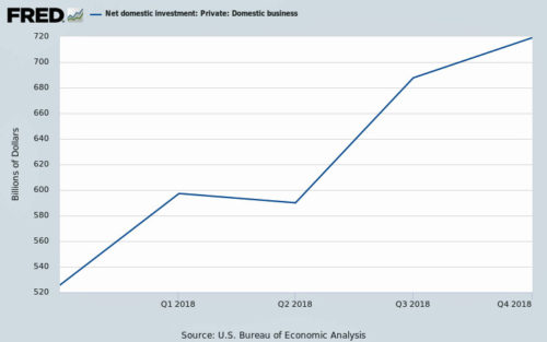 The GDP grew at a more rapid rate during year 2018, up about $1160b compared to growth of $852b in year 2017, or an additional $300b in the rate of growth. The kicker is that Federal Government Spending (shown above), which added $110B to the GDP, coupled with the $200b increase in net domestic investment (cited previously) accounted for that added growth. The additional trade deficit of $69b (cited previously) subtracted from the GDP growth, but can be accounted for by a partial spending stimulus from the $330b stock buybacks due to the profit repatriation (cited previously). Sufficient evidence exists that other mechanisms than the tax cuts were responsible for the added growth to the GDP.