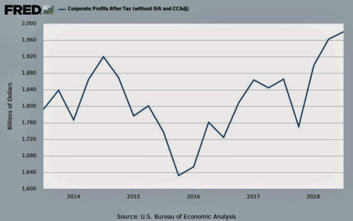 According to Department of the Treasury reports, corporate tax receipts fell by 28 percent – from $223 billion in 2017 to $162 billion during the first nine months of fiscal year 2018. For that reason, as the following chart shows, the Federal Government deficit, which has increased in all of years of Trump’s presidency, increased by $114 billion. If $75b taxes had not been collected on the $500b of repatriated profits, the deficit would have increased by $189b. Because the defict increased, it can be argued that the deficit increase, caused by the tax cuts, stimulated the economy.