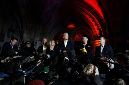 Assange on steps of High Court in London, December 2010 (Photo by Stefan Wermuth for Reuters)