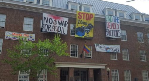 The Embassy Protectors arrested inside and outside will continue to defend themselves in court. The next hearing of the four inside Embassy Protectors has been moved to this Friday, May 31 at 9:30 am before the chief judge of the US District Court in Washington, DC, Judge Beryl A. Howell. Ironically, as we were serving as interim embassy protectors with the permission of the democratically-elected Venezuelan government, the four were charged with violation of 18 U.S. Code §”118. “Interference with certain protective functions.” Anyone who followed the activities during the Embassy Protection Collective’s actions can see the State Department was failing to protect the embassy as it allowed pro-coup advocates to break windows and doors, break and enter into the building, deface the building and assault people outside the building while threatening those inside the building.