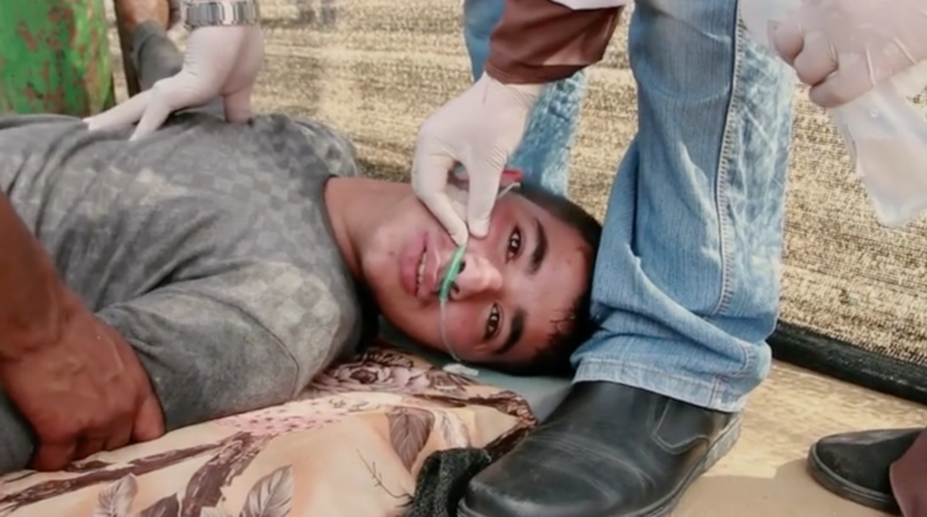 While this goes unremarked in the film, there are indications that the “tear gas” Israeli drones poured on people may have been particularly virulent. In the film we see some people convulsing, and one man is delirious. This seems reminiscent of a mysterious gas used in Gaza in early 2001 that caused similar symptoms (reported in the James Longley documentary Gaza Strip).