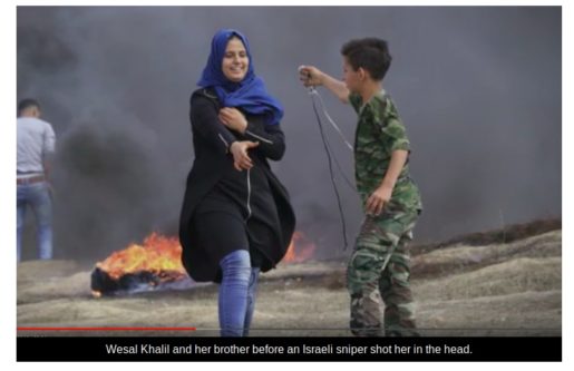 The film shows people who are just standing there suddenly being picked off by snipers. It shows a 14-year-old girl chatting with a friend, then suddenly being shot in the head. And it shows her little brother, who had been with her, later describing how his sister had been killed. This is not footage that Israeli hawks wish American audiences to view.
