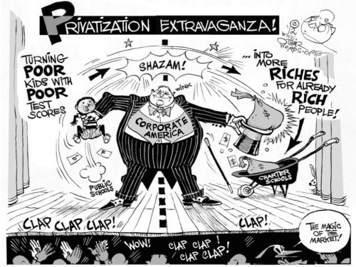 A continually falling rate of profit under capitalism, especially in the neoliberal period which started in the late 1970s, has forced major owners of capital to parasitically funnel public funds and assets to themselves through diverse pay-the-rich schemes. In education, the main such scheme is charter schools. As a result, billions of public school dollars and billions of dollars’ worth of public school facilities have been seized over the years by private charter school owners-operators. Privatization necessarily results in higher costs, more corruption, more inefficiency, and lower quality service.