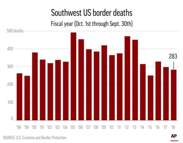 The unfortunate father and daughter depicted in the image above, and how they relate to Frey’s narrative, merit notice. The AP story ((Peter Orsi and Amy Guthrie, “A grim border drowning underlines peril facing many migrants”, AP News, June 26, 2019.)) from which it was taken included a graph illustrating death rates at the border over the last twenty years, based on U.S. Customs and Border Patrol stats. These peaked, we are to believe, at nearly 500 in 2005, and again in 2013, before declining to last year’s number, 283. The father and daughter’s deaths occurred on the Mexican side of the border, so the thoroughness of the accounting for their loss of life may be hard to determine. However, a key matter to understand, as Frey tells us, is that the Border Patrol consistently and knowingly undercounts the dead, ignoring the significant numbers of border deaths discovered by others (while also sometimes exaggerating apprehensions). Such policies misinform the public, certainly, obscuring the conscious lethal-desert-method of deterrence, while playing up the apprehension-method. In Vietnam, official body-counts of enemies killed were controversial, but reportedly exaggerated to demonstrate achievement of official goals; body-counters, for bureaucratic reasons, simply double- or triple-counted those dead they found. At the modern U.S.-Mexico border, bodies are undercounted because the understood policy of deterrence by death cannot be broadcast—and so the Border Patrol ignores those dead found by others, dead who thereby do not exist in official counts converted into published graphs like the one accompanying the AP News story.