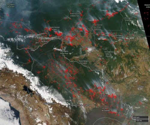 Map showing heat (the red dots) and smoke in Bolivia and Brazil detected by a satellite August 14, 2019. WildfireToday.com.