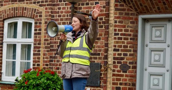 Annie Woods initiated a FridayForFuture demonstration in the nearby town, Holsetebro. Around 50 Tvind students and teachers participated alongside a few locals. They were inspired by the Swedish teenager Greta and by their own Peace and Justice Conference last May (Photo by Jenny Jagodics)