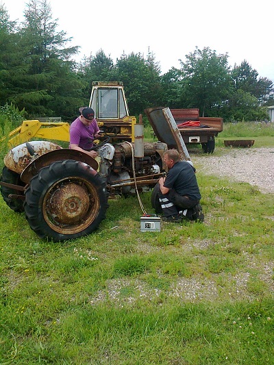 Tvind maintenance worker with special student helper in the seat hope to use parts from this old tractor for another tractor before having to buy a new one (Ron Ridenour photo)
