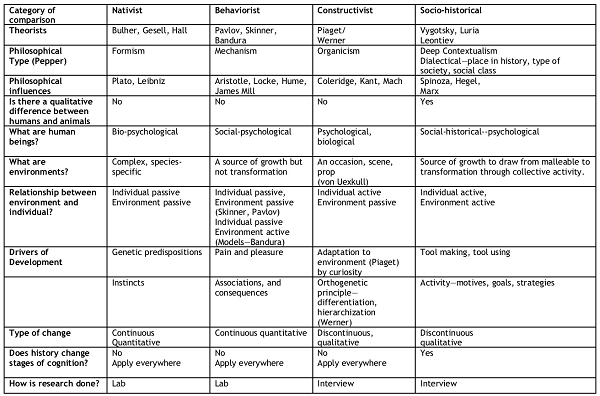 There are four major theories of human development. The Freudian psychoanalytic theory is not included here because most of Freud’s theory has been either proven wrong or it has not been subjected to scientific experiment. Of the four theories, nativist, behavioral, constructionist and socio-historical, the first three come out of bourgeoisie psychology which began at the end of the 19th century. Only the last theory is socialist.