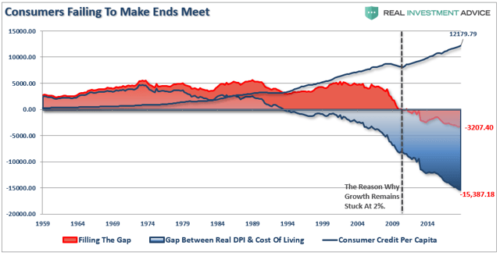 Looking just at the consumer debt gap, in 2019 80% of US households had to borrow to meet expenses. See this chart provided by Lance Roberts in an April 2019 article on Seeking Alpha: