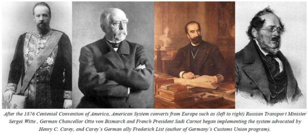 In Germany, the American System inspired Zollverein (custom’s union) had not only unified a divided nation, but elevated it to a level of productive power and sovereignty which had outpaced the monopoly power of the British East India Company. In Japan, American engineers helped assemble trains funded by a national banking system, and protective tariff during the Meiji Restoration.