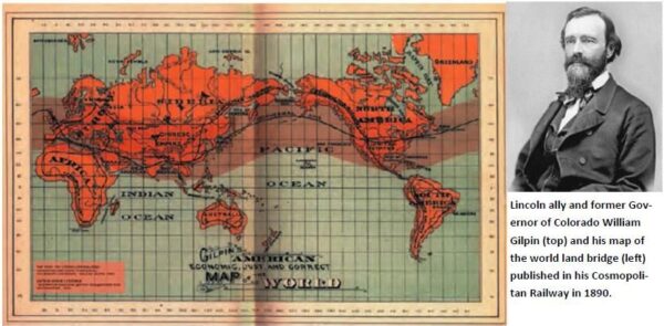The construction of continental railroads, and industrial powers of nations internationally was quickly bringing the world land bridge concept first elaborated by Colorado’s Governor William Gilpin quickly into being. For those who are unaware, Gilpin (who was also Lincoln’s body guard and loudest advocate of America’s transcontinental railroad) spent decades championing the international system of win-win cooperation which he outlined in his 1890 Cosmopolitan Railroad stating: