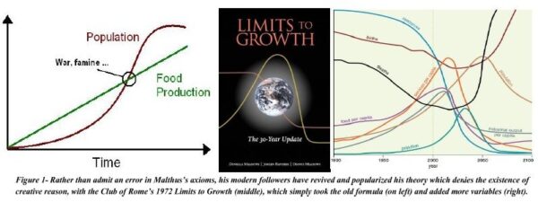 The science of “limits” became the foundation of an oligarchical economic science for the elite and naturally had to be kept hidden from the minds of the general population since it followed Thomas Malthus’ mathematical principle of population growth. Malthus’ “principle” of population supposed that unthinking humans reproduce geometrically while nature’s bounty only grows arithmetically and as such periodic population collapses were an unavoidable law of nature which could at best be managed by an oligarchical scientific priesthood who were obliged to periodically cull the herd.