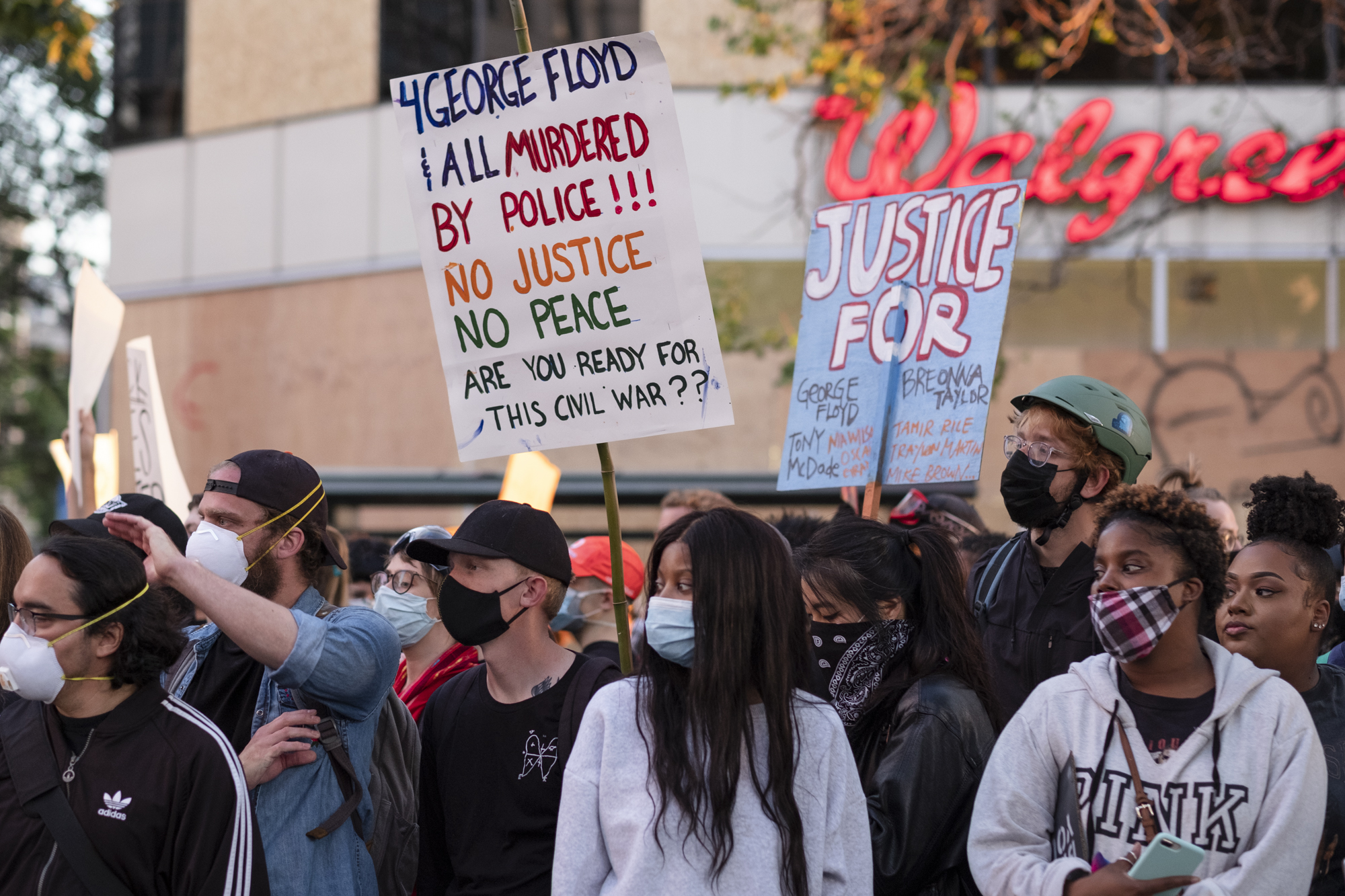 Signs and banners read “Black Lives Matter” and “Defund the Police.” Others were about our civil liberties, our Constitutional right to assemble peacefully. Many bore the names of George Floyd and numerous other victims of police murder. But there were no speeches this evening, probably no need for any.