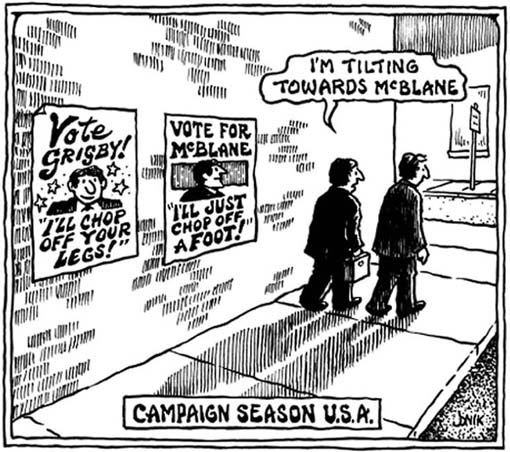 In recent years I’ve developed an additional reason for rejecting lesser-of-two-evils voting. Lesser-of-two-evils voting allows the Democratic Party to move to the right. That is because if the Republican candidate is more reactionary than the Democratic candidate, then the Democratic candidate can move further to the right and still be the lesser evil as long as he or she does not become as reactionary as the Republican candidate. And the Democratic Party’s move to the right allows the Republican Party to move even further to the right. In other words, lesser-of-two-evils voting sets certain causal forces into operation and the result is to further reactionary values and corporate interests.