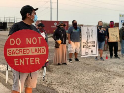At present, a conflict is taking place along the US-Mexico border where construction of the wall is violating indigenous sovereignty and rights. A group of tribes in the Kumeyaay Nation are suing the federal government for blocking their access to “sacred sites, trails, plants and medicines, as well as a number of historic landmarks.” And activists in Arizona from the Tohono O’odham Nation are waging a direct action campaign to physically block construction of the wall there that will stop them from having access to a sacred site and source of water, the Quitobaquito Springs.
