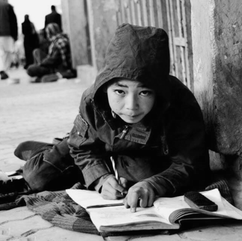 A child labourer studying on a Kabul street