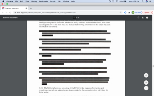 On page 4, the guidelines for drone strikes allow for lethal action against those who are not “high value targets,” without explaining the criteria the CIA would use to identify someone as an imminent threat to the security of the United States. On page 12, the co-authors, Haines among them, redacted the minimum profile requirements for an individual “nominated” for lethal action. The very term “nominated” suggests an effort to sugarcoat targeted assassination, as though the bombing target is recomended for a U.S. presidential cabinet position. [NOTE: You might (somewhat sarcastically) want to put “[sic]” after the first use of the word “nominated”]