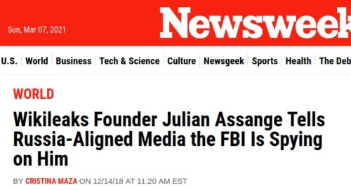 A Newsweek headline from 2018 still reads ‘Wikileaks Founder Julian Assange Tells Russia-Aligned Media the FBI Is Spying on Him’. But he only addressed a court in Ecuador. Telesur was among those covering his testimony, yet simply mentioned “a video conference” without making the legal context explicit. As this outlet is known for resisting US narrative, it may be unsurprising that Newsweek conjured an exclusive release from Assange to enemy propagandists.