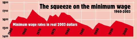Two dollars an hour may not seem like a lot of money, but unfortunately for Ann Marie Grey, it is. Grey works at a McDonalds in Binghamton, N.Y., where she currently makes $6 an hour. Ann told a New York television station that with her college degree, she “expected to go out and find a job for $8, $10 an hour,” she said. Instead, it’s been minimum wage all the way. “My daughter's going to have a baby,” she says. “I'm going to be a grandma and I can't afford to buy her things. My son understands our financial condition, but he just wants a zip-up hoody, and I can't afford to buy him one.” Women like Grey are all too familiar in minimum-wage America. They are food service workers, retail workers, janitors, clerical workers. The retail industry has a disproportionate number of workers who earn at or below the minimum wage. According to the Bureau of Labor Statistics, in 2003, retail workers made up only 22 percent of the workforce, but 62 percent of those at or below the minimum wage. Contrary to the myth spun by Corporate America, the majority of minimum-wage workers aren’t teenagers making a little extra money after school. They are men and women trying to support families. According to a 2004 briefing by the Economic Policy Institute (EPI) titled No Longer Getting By: An Increase in the Minimum Wage Is Long Overdue, if the minimum wage were to be increased to a modest $7 an hour, 72 percent of those who would be directly affected are over the age of 20. Forty-four percent work full-time (working at least 35 hours a week), and 36 percent of families with workers who would benefit from an increase rely exclusively on that person’s wages. “The minimum wage hasn’t been raised in seven years now, the second longest period in the history of the minimum wage that the Congress has failed to act while workers’ wages fall further and further behind,” Jen Kern, director of the Living Wage Resource Center for the Association of Community Organizations for Reform Now (ACORN) told Socialist Worker. In 1938, Congress passed the Fair Labor Standards Act, which established the minimum wage, as well as the 40-hour workweek and a ban on child labor in interstate commerce. The law was supposed to stave off some of the worst employer abuses during the Great Depression. The last increase in the minimum wage was in 1997, when it was raised from $4.75 to $5.15 over two years. Because it’s not tied to inflation, the value of the minimum wage has been eaten away over time. Over the last few decades, the gap between the minimum wage and the average hourly earnings for workers has grown into a yawning chasm. In the 1950s and '60s, the federal minimum wage averaged 50 percent the average hourly earnings. In the 1970s, it was 44 percent; and, in the 1980s and '90s, 39 percent. Today, the figure is 33 percent. “It hasn’t been that low since 1949,” Amy Chasanov, deputy director of policy at the Economic Policy Institute (EPI) told Socialist Worker. “Since 1997, there have been significant increases in the cost of living--gas prices, milk prices and all sorts of essentials for getting by. “The price for people just meeting their most basic needs has gone up a whole lot, and meanwhile, folks who are earning minimum wage are still stuck at the same amount.” A full-time worker who works year-round for the minimum wage makes about $10,700 a year. That’s $4,958 below the U.S. government’s official poverty line for a family of three, and $8,138 below the poverty line for a family of four. A worker trying to support a family of four would have to make $9.06 an hour to rise above the poverty line. Take into account the fact that the poverty line is based on an antiquated formula from the 1960s that doesn’t take into account the added expenses for families today, such as rising health care and child care costs, and you have a disaster in the making. “The minimum wage is nowhere even close to the poverty level, which is nowhere close to what it takes to live,” ACORN’s Kern said. “There’s huge gap in what our country considers a sustainable wage floor and what it takes to sustain humans.” So it is no surprise that many minimum-wage workers turn up at food pantries and homeless shelters. Ellen Christmas, manager of the Food Shelf program in Grand Rapids, Minn., says that the percentage of people who rely on her food pantry to feed their families has increased by about 25 percent every year for the last four years. Forty percent of those families have at least one person working, she told the Grand Rapids Herald-Review. “It’s sad because we have people coming in here in their work uniforms,” said Christmas. “If you’re a single mother and making minimum wage, you can’t make it on your own.” According to a report by America’s Second Harvest, in 2001, four out of 10 households who received emergency food assistance from soup kitchens, food pantries and shelters had at least one employed adult in the family. Of the adults in these households, 17 percent worked full-time. According to a 2001 report by the National Low Income Housing Coalition, the national median housing wage--which is based on each county’s housing wage for a two-bedroom unit at the fair market rent--is $13.87 an hour. That’s almost three times the federal minimum wage. Women and minorities are most impacted by the low minimum wage. “Earlier this year, we looked into who would be affected if the federal government raised the minimum wage to $7,” said Chasanov. “We estimated that 7.4 million workers would be helped -- and 61 percent would be women.” And while African American workers are only 11 percent of the total workforce, they would be about 15 percent of the people helped by an increased minimum wage. Hispanics are 13 percent of the workforce, yet they’d be 19 percent of those who would get some relief from an increase. Politicians like California’s Gov. Arnold Schwarzenegger