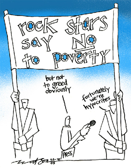 On the front page of The Guardian, the Age of Irony was celebrated as real life became more satirical than satire could ever be. There was Bob Geldof resting his smiling face on smiling Blair's shoulder, the war criminal and his jester. Elsewhere, there was an heroically silhouetted Bono, who celebrates men like Jeffrey Sachs as saviors of the world's poor while lauding "compassionate" George Bush's "war on terror" as one of his generation's greatest achievements; and there again was Brown, the enforcer of unfair rules of trade, saying incredibly that "unfair rules of trade shackle poor people"; and Paul Wolfowitz, beaming next to the Archbishop of Canterbury: this is the man who, before he was handed control of the World Bank, devised much of Bush's so-called neo-conservative putsch, the mendacious justification for the bloodfest in Iraq and the notion of "endless war". And if you missed all that, there is a downloadable PDF kit from a "one Campaign" e-mail to "help you organize your very own ongoing Live8 party." The suppression of African singers and bands, parked where Geldof decreed, in an environmental theme park in Cornwall, in front of an audience of less than 50 people, was described correctly by Andy Kershaw as "musical apartheid." Has there ever been a censorship as complete and insidious and ingenious as this? Even when Stalin airbrushed his purged comrades from the annual photograph on top of Lenin's mausoleum, the Russian people could fill in the gaps. Media and cultural hype provide infinitely more powerful propaganda weapons in the age of Blair. With Diana, there was grief by media. With Iraq, there was war by media. Now there is mass distraction by media, a normalizing of the unmentionable that "the state has lost its mind and is punishing so many innocent people", wrote the playwright Arthur Miller, "and so the evidence has to be internally denied." Deploying the unction of Bono, Madonna, Paul McCartney and of course Geldof, whose Live Aid 21 years ago achieved nothing for the people of Africa, the contemporary plunderers and pawnbrokers of that continent have pulled off an unprecedented scam: the antithesis of 15 February 2003 when two million people brought both their hearts and brains to the streets of London. "(Ours) is not a march in the sense of a demonstration, but more of a walk," said Make Poverty History's Bruce Whitehead. "The emphasis is on fun in the sun. The intention is to welcome the G8 leaders to Scotland and ask them to deliver trade justice, debt cancellation and increased aid to developing countries." In Lewis Carroll's classic, Alice asked the Cheshire Cat and the Mad Hatter to show her the way out of wonderland. They did, over and again, this way, that way, until she lost her temper and brought down her dream world, waking her up. The people killed and maimed in Iraq and the people willfully impoverished in Africa by our governments and our institutions in our name, demand that we wake up. John Pilger is an internationally renowned investigative journalist and documentary filmmaker. He is currently a visiting professor at Cornell University, New York. His film, Stealing a Nation, about the expulsion of the people of Diego Garcia, has won the Royal Television Society's award for the best documentary on British television in 2004-5. His latest book is Tell Me No Lies: Investigative Journalism and its Triumphs (Jonathan Cape, 2004). Visit John Pilger's website: www.johnpilger.com. Thanks to Lorna Moxham at Granada Media. Other Recent Articles by John Pilger * The G8 Summit: A Fraud and a Circus