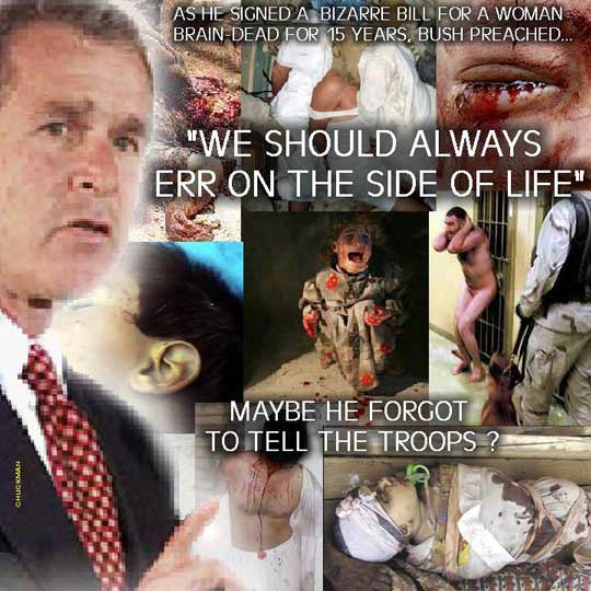 One would have to be a recent arrival from the planet Grornak (which is pretty far away -- at least a couple million miles or so), to not know George W. Bush has anointed himself -- or, rather, considered himself anointed by the Great Anointer -- the protector of some weird form of Christianity. When asked once to name his favorite philosopher, Bush said, “Christ.” I’ve often wished there’d immediately been a follow-up to determine if Dubya meant the purported Son of God, or Charles Manson during his messianic phase. ‘Cause if we’re talkin’ mass murder, George’s body count puts ol’ Charlie’s to shame. I’m going to take a flier here and wager I’m not the first to notice that lying a nation into war that, so far, is responsible for the deaths of around 100,000 humans (even if they are, ya know, only Muslims), doesn’t exactly keep with Christian principles, unless there’s some secret “Christians for Killing” cult of which I’m not aware. The more cynical amongst us might even wonder if Bush’s use of the exceedingly incendiary term “crusade” shortly after 9/11 was a mistake, after all....(full article)